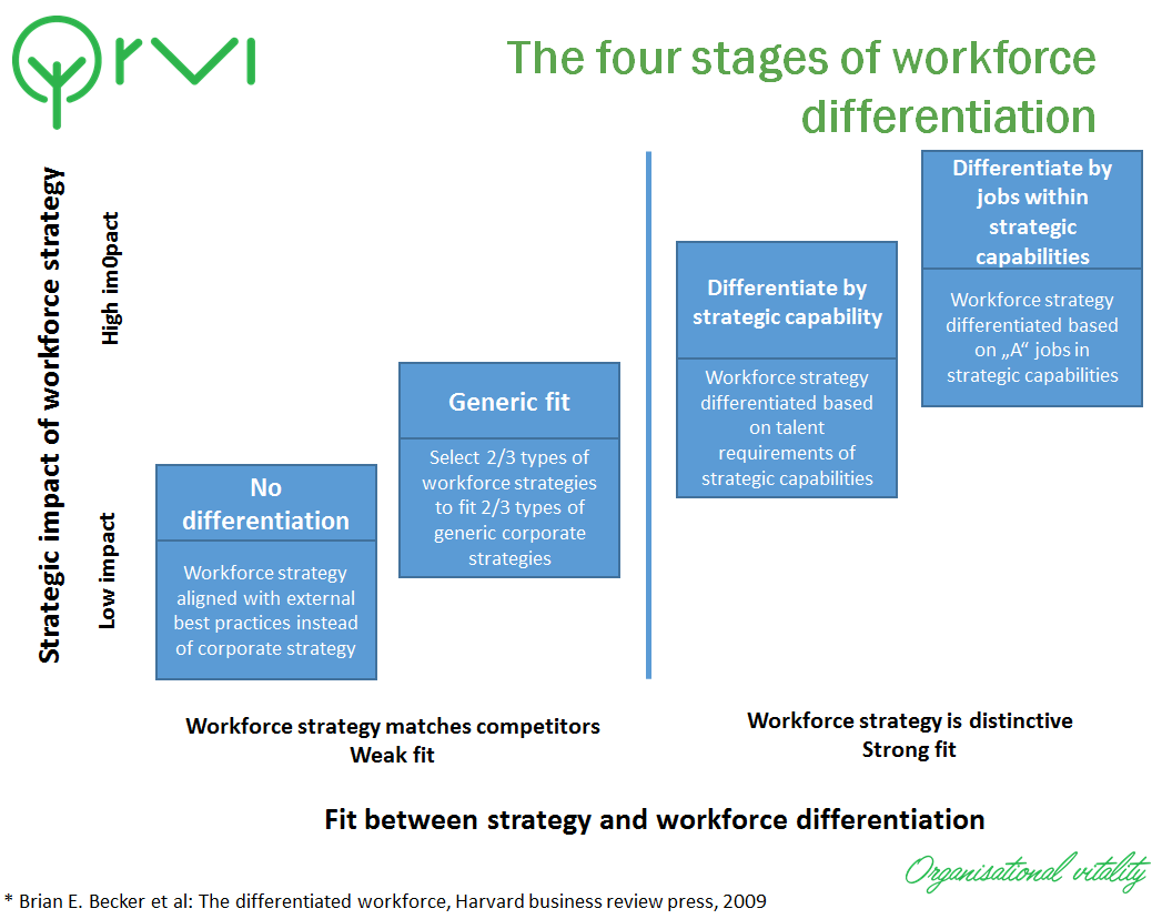 The new option HR expertise offers is a differentiated HR strategy. The main idea of the concept of a differentiated strategy is to understand and to take into account which job positions and which employees truly influence and truly contribute to the implementation of the business strategy. Strategically critical positions and well performing individuals in these positions should be granted more than proportional attention. This attention can be expressed through e.g. different recruiting procedure, different leadership style, rewarding, training and different career path for these positions.